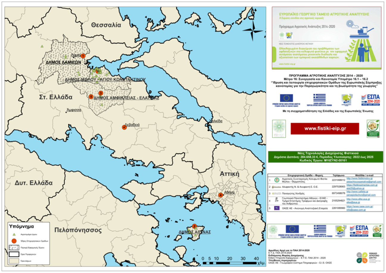 Στο έργο συμμετέχουν 3 παραγωγικοί φορείς από τις κύριες περιοχές καλλιέργειας φιστικιού (Αίγινα, Φθιώτιδα), οι οποίοι θα διαθέσουν φιστικεώνες, αλλά και προϊόν.